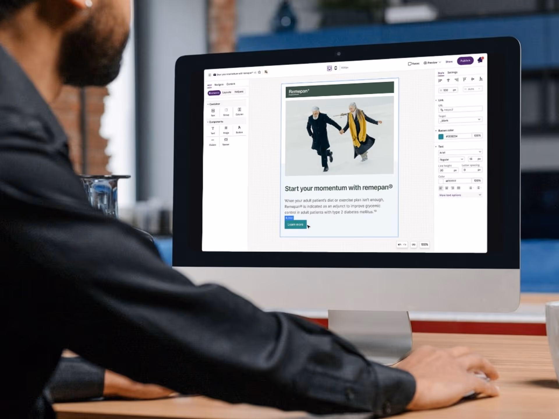 It just takes seconds to insert content elements, rearrange on screen, make copy edits, and alert MLR for required approvals