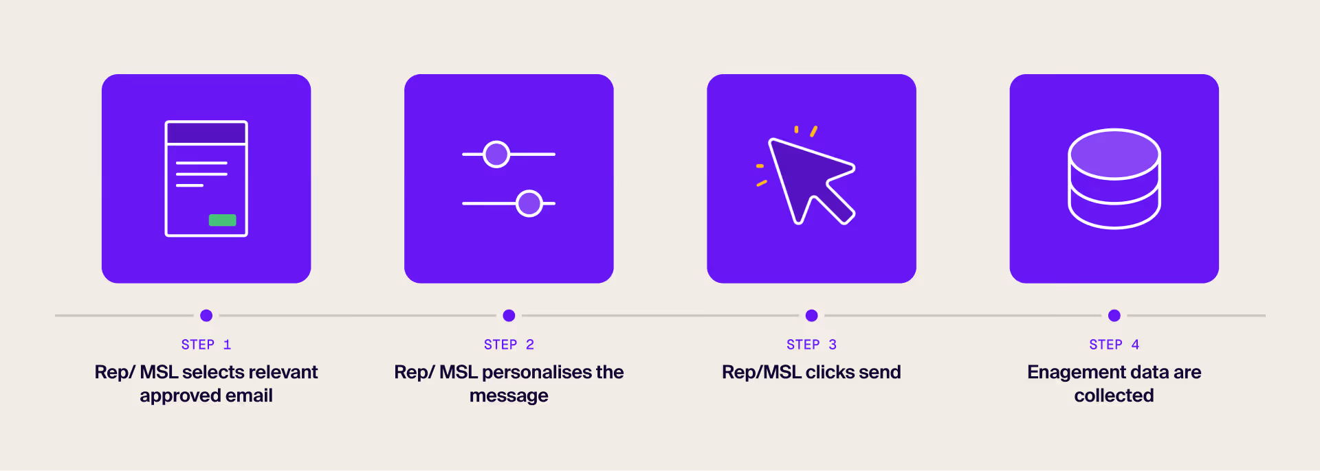 Efficiency: A simple, but still important, benefit of approved email is that it saves reps and MSLs time. They are likely already having to write numerous emails to invite HCPs to online events or arrange detailing sessions. The ability to quickly select from prepared content makes email creation go much faster. And it enables reps to feel confident because the content is prepared, approved and provided in a professional format. By freeing up time, approved email enables reps and MSLs to focus on their customers: planning engagements and tailoring content to meet individual HCP needs.