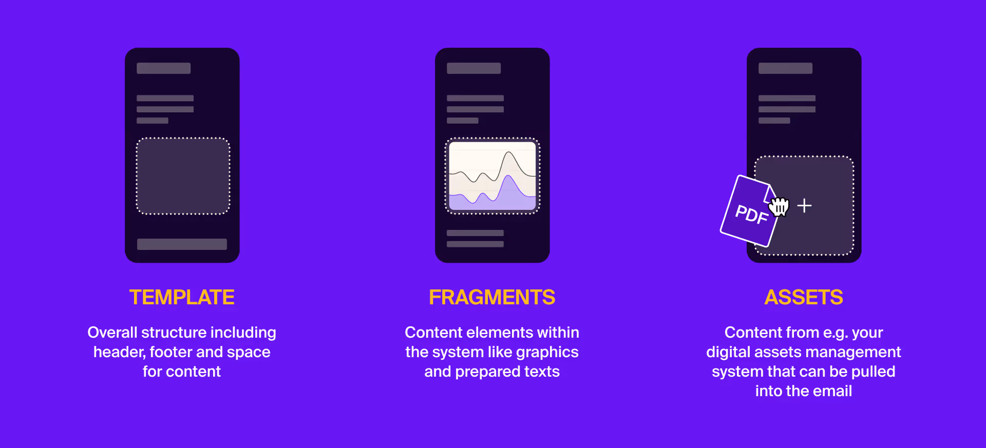 A major strategic decision will be ‘rep configuration’ or the level of personalisation that the rep will be able to add to their approved emails. There are many options and solutions for this. To see what’s possible, it’s important to understand the basic structure of approved email. There are essentially three major content categories: what is automatically generated and always in place (the template), what can be selected by the rep within the approved email (fragments), and then what can be added by the rep from outside the approved email system (assets).